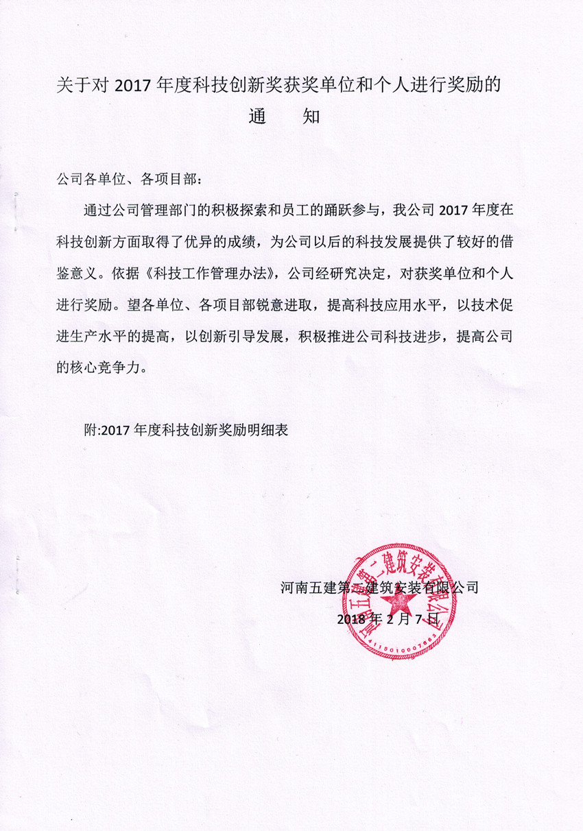 關(guān)于對2017年度科技創(chuàng)新獎獲獎單位和個人進行獎勵的通知